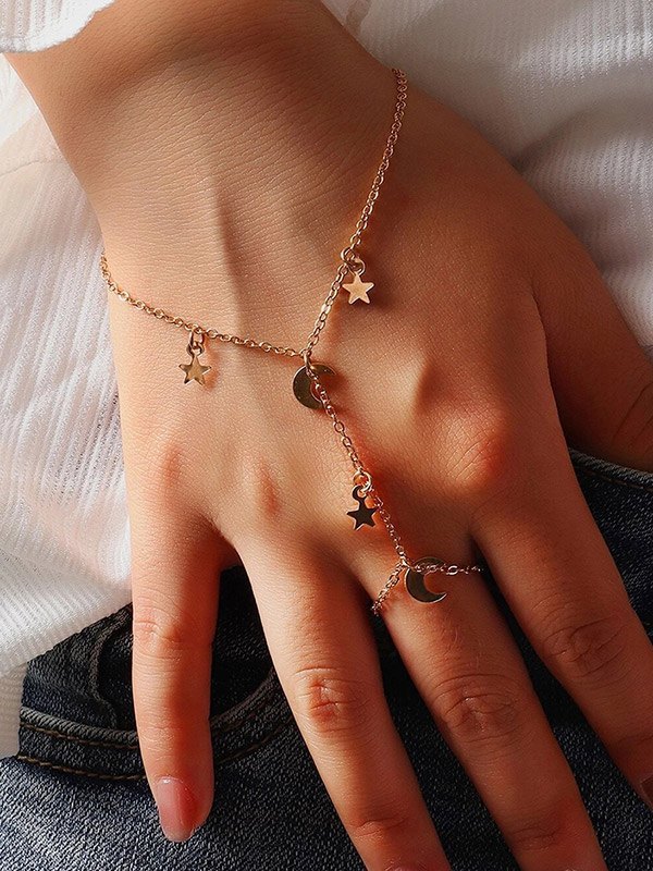 Pulsera esclava de cadena con anillo de dedo de estrella y luna