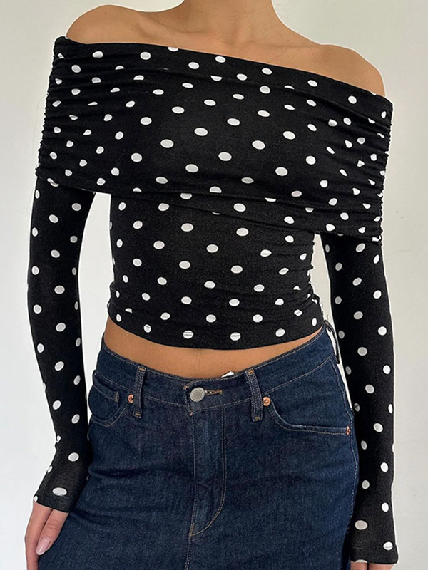 Camiseta de manga larga con lunares y un hombro al descubierto