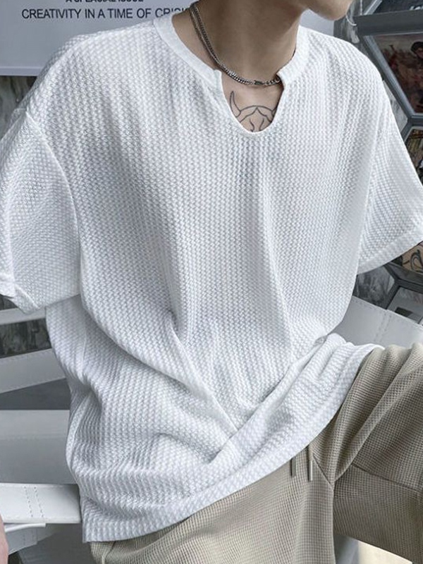 Camiseta de manga corta con cuello con muescas de malla sólida para hombre