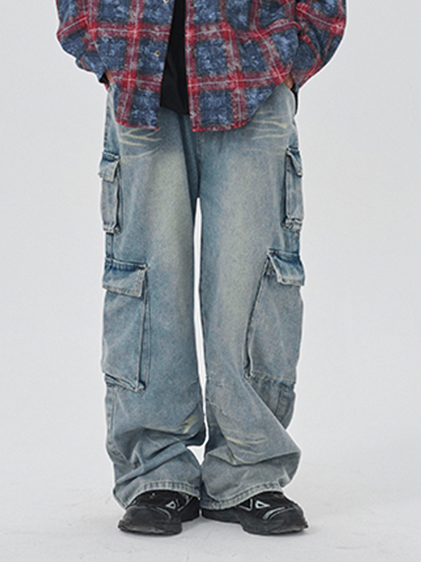 Vaqueros cargo lavados con múltiples bolsillos para hombre