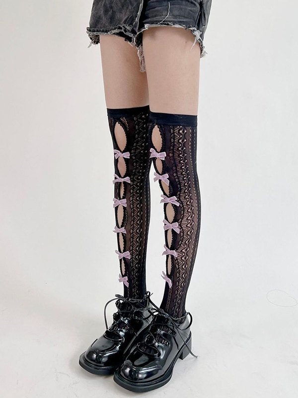 Calcetines altos hasta el muslo con encaje recortado y adorno de lazo