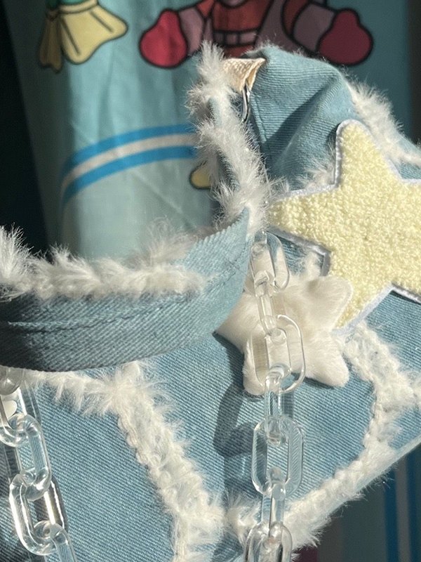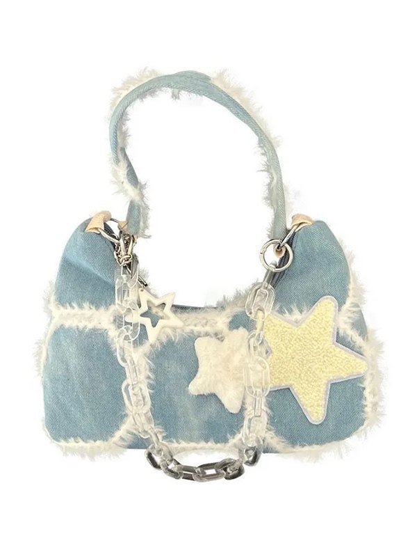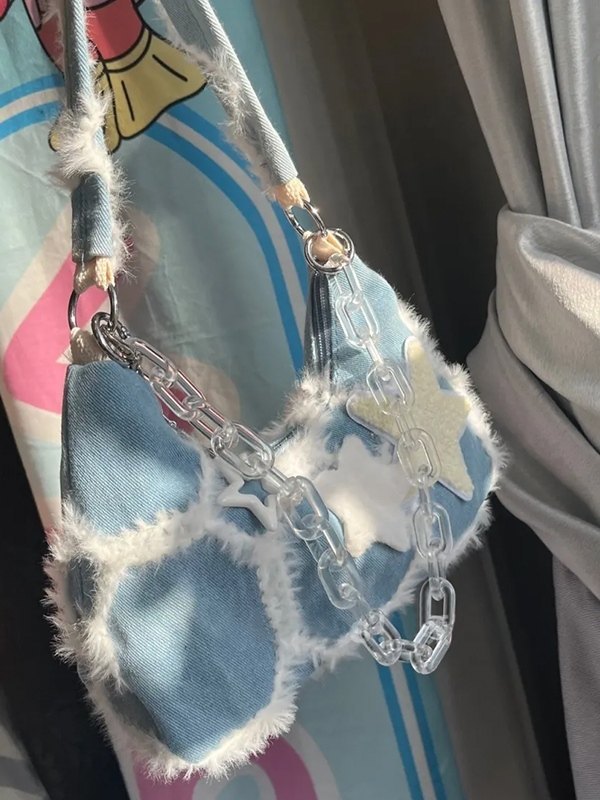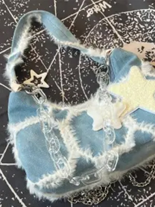 Detalles: Estos estos lindos bolsos incluyen una correa de cadena para el hombro, tiene una insignia de estrella difusa parcheada, cuenta con adornos difusos y un diseño de bragueta con cremallera. /Festival