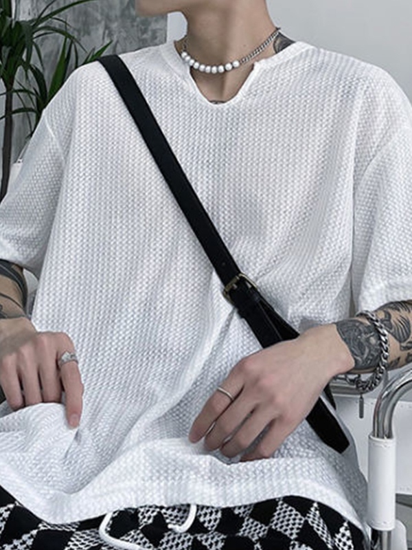 Camiseta de manga corta con cuello con muescas de malla sólida para hombre