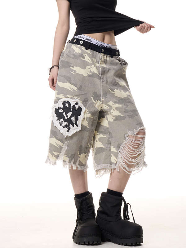 Shorts vaqueros vintage con parches rotos y camuflaje